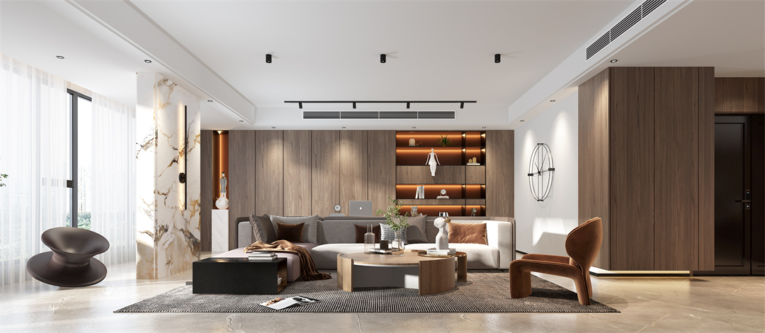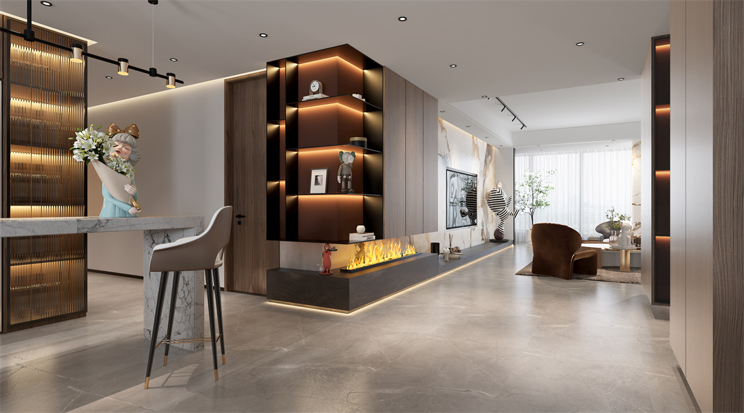 客厅影视墙采用岩板大理石瓷砖上墙,质地比较现代且温润时尚,营造出大气时尚的居室氛围。